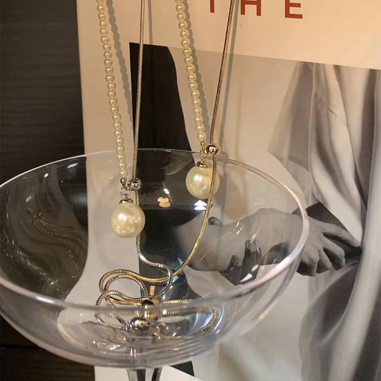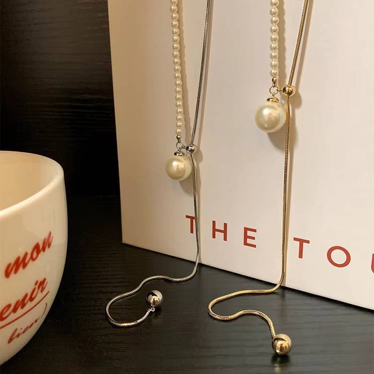スネークチェーンとパールのロングネックレス