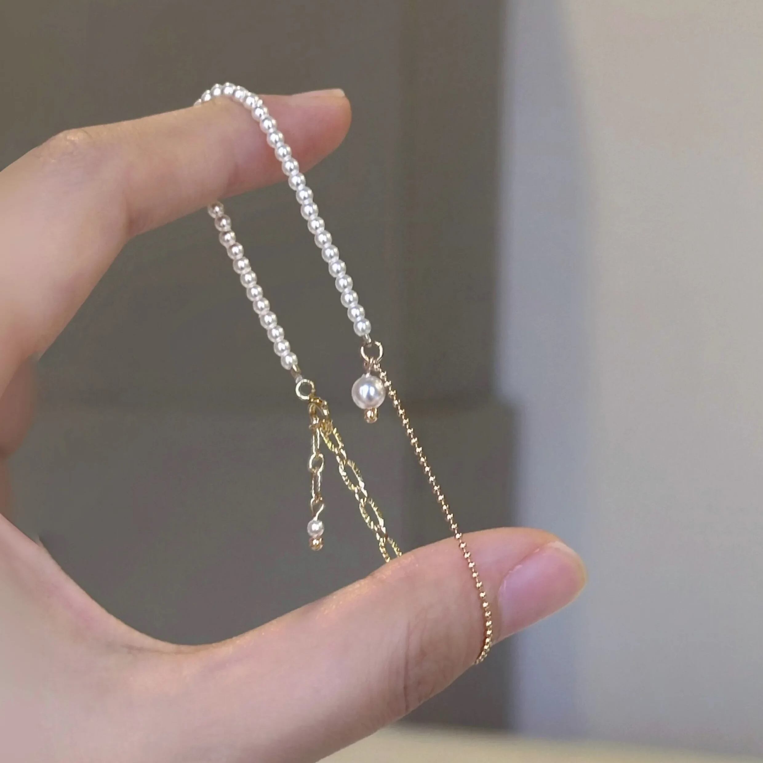 小粒のパールとミニマルなチェーンを1本に組み合わせたデザインが