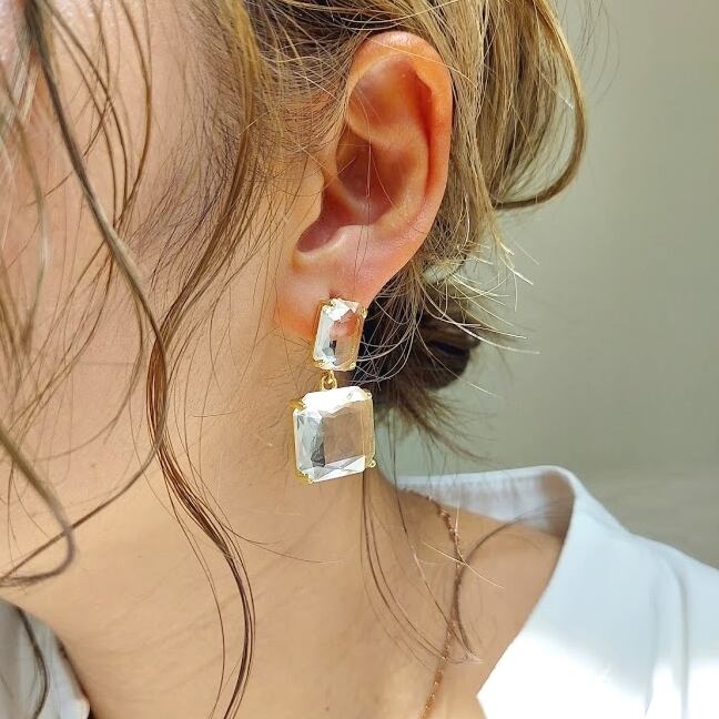 ダブルスクエアカットのピアスが涼しげなアイテム。