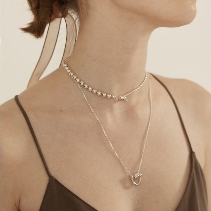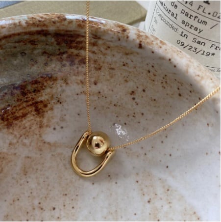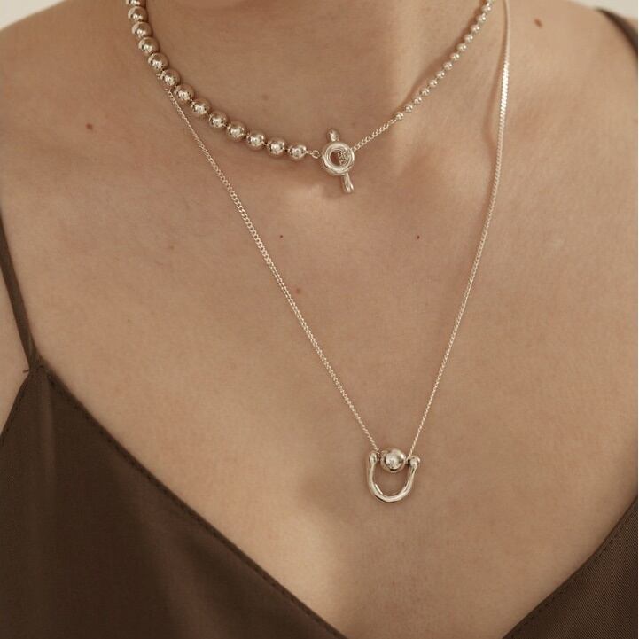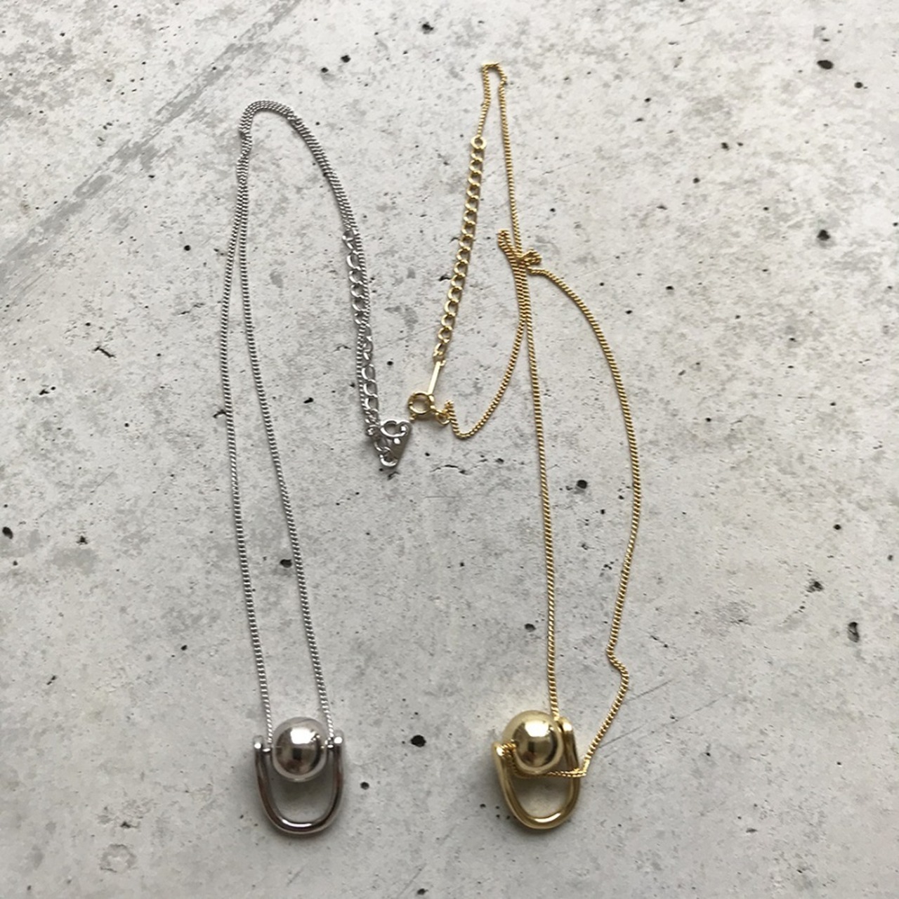 U字型デザインネックレス。モチーフ内のボールがポイント!大人の女性のデコルテにしっくり決まる上品なデザインネックレスです。