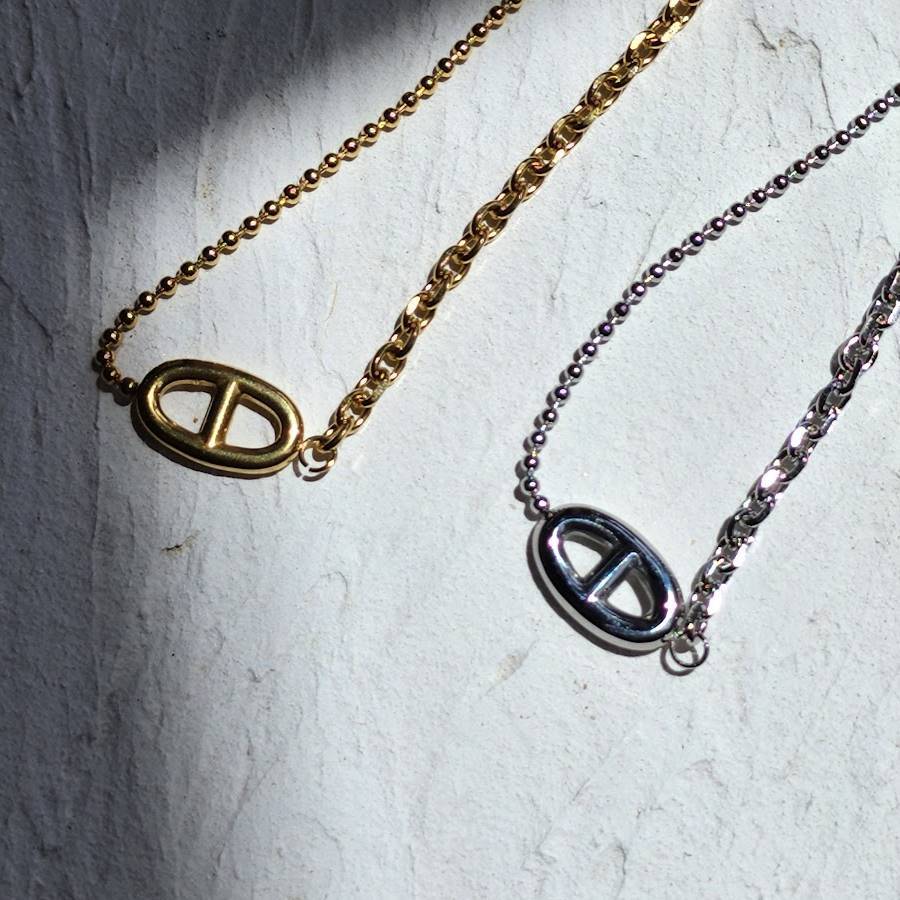 "H"のモチーフと2つの異なるチェーンが目を引くネックレス