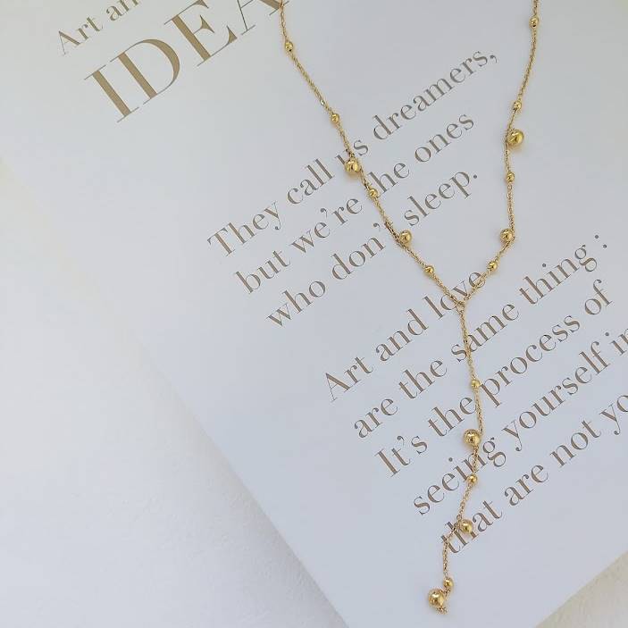 大小不揃いなゴールドボールがちりばめられたY字ロングネックレス。